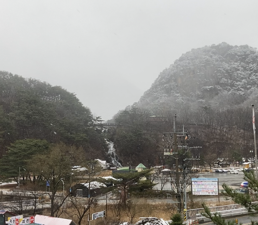 방 경치는 배정받은 방이 산정호수가 보이는 곳이였는데, 호수에서 떨어지는 폭포가 바로 보이기도 하고 산세가 한눈에 들어오는 경치라 좋았습니다.