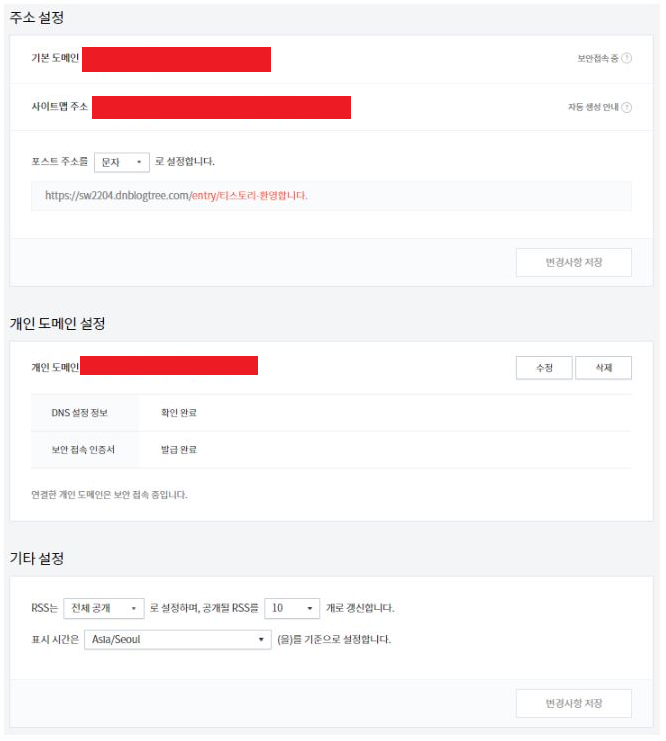 - 포스트 주소를 문자로 설정합니다. 개인 도메인은 유료 도메인을 구매한 경우 해당 주소를 등록하면 됩니다. 등록하고 일정시간이 지나면 (등록에 이상이 없다면)자동으로 DNS 설정정보 확인 및 보안접속 인증서 발급이 완료됩니다.