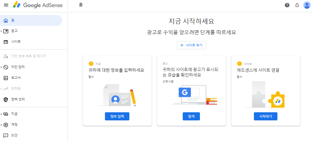 - 애드센스 가입: 우선 애드센스(https://www.google.com/intl/ko_kr/adsense/start/)에 접속해서 시작하기를 눌러 가입하려는 구글 계정으로 가입을 합니다. 아직 사이트 없음으로 하시면 됩니다. 만일 유료 도메인을 사용하지 않으실 예정이라면 개설해둔 블로그 주소를 입력해주시면 됩니다.