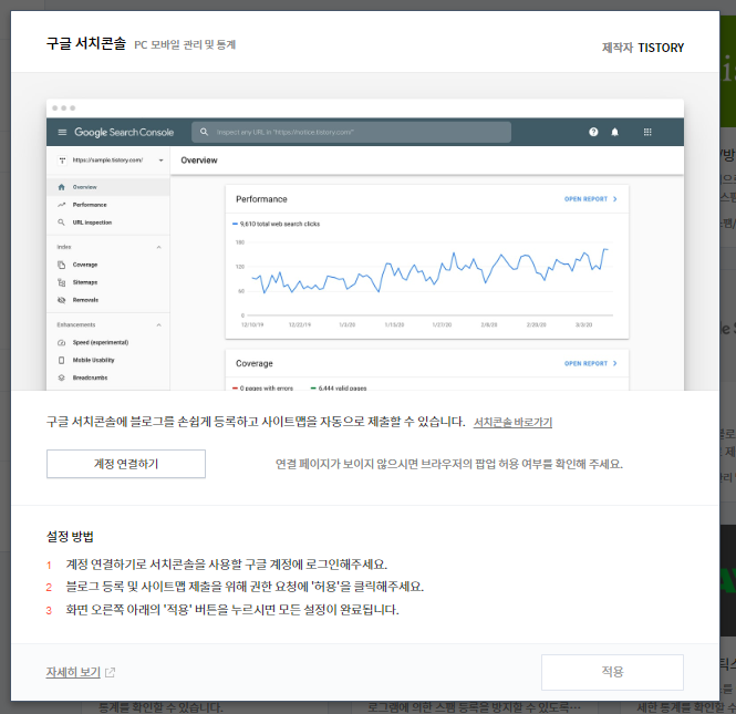 - 플러그인에서 아래로 드래그 해보시면 미사용중인 플러그인을 확인하실 수 있습니다. 그중에서 구글 서치콘솔을 클릭하시면 아래와 같이 계정연결하기로 계정을 연결하시고 적용을 하시면 됩니다.