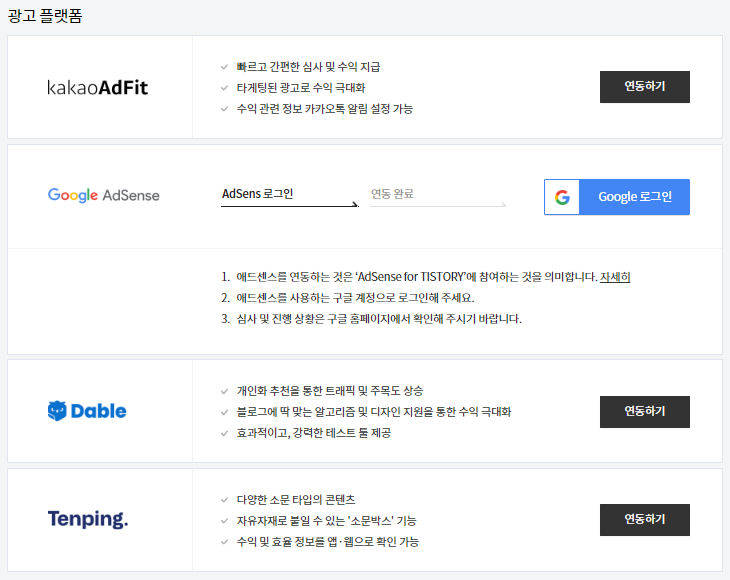- 티스토리 애드센스 연동: 다시 블로그 설정으로 돌아와서 수익으로 이동합니다. 아래와 같이 여러 광고 플랫폼이 나오는데, 이런게 있구나 하시면 됩니다. ㅎㅎ; 우리의 관심사인 구글 애드센스에 연동하기를 누르면 구글 계정을 입력하는 창이 뜨고 로그인 하면 연동이 완료됩니다. 저는 이미 연동이 완료된 상태라 아래와 같이 로그인 아이콘이 나타납니다.