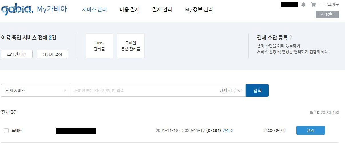 - 구매를 완료하시면 문자로 도메인 등록 완료 문자가 오며, My 가비아가 가시면 구매한 도메인을 확인 하실 수 있습니다.