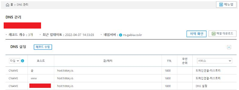 (2) 추가운영하는 블로그에 하위 도메인 연결(티스토리)