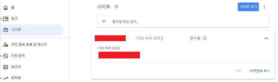 - 애드센스 메뉴에서 사이트로 들어서 등록된 사이드의 내용을 펼칩니다. (저는 이미 하위 도메인이 등록된 상태라 아래와 같이 보입니다.)