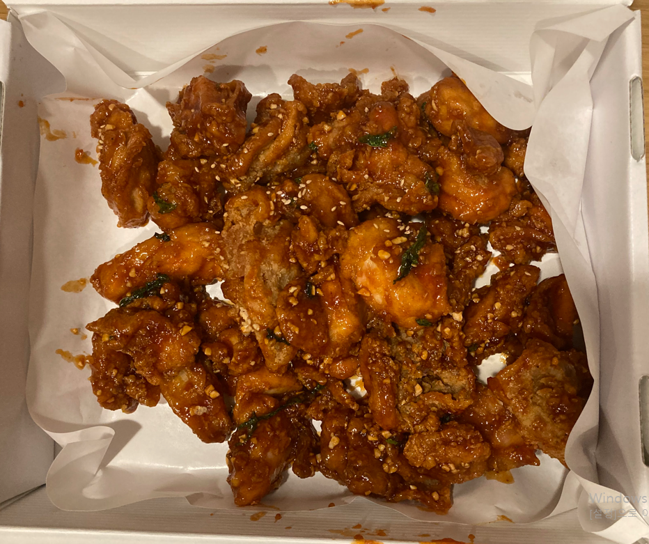 닭 껍데기 튀김이 있어 퍽퍽함이 덜하고 가슴살과 조화로운 구성 양념에 절여진게 아니라서 양념맛과 후라이드의 바삭함을 한번에 맛볼 수 있음 |