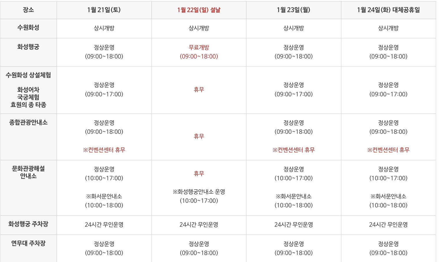 카테고리 없음 수원시 화성행궁 무료개방(2023년 설 연휴) 블로그's 아카이브 2023. 1. 20. 18:07 반응형 수원시에서는 명절에 종종 화성행궁을 무료개방하는데요. 이번 설 명절에도 무료개방한다고 하니, 명절음식으로 나온배 부여잡고 화성행궁 나들이 한번 하시죠.^^수원시 화성행궁 무료개방 2023년 설 연휴 일자별 시설 운영 안내 수원시 2023년 설 연휴 일자별 시설 운영 안내 수원시 2023년 설 연휴 시설 운영 안내 바로가기 반응형 공유하기 게시글 관리 PnF Bear