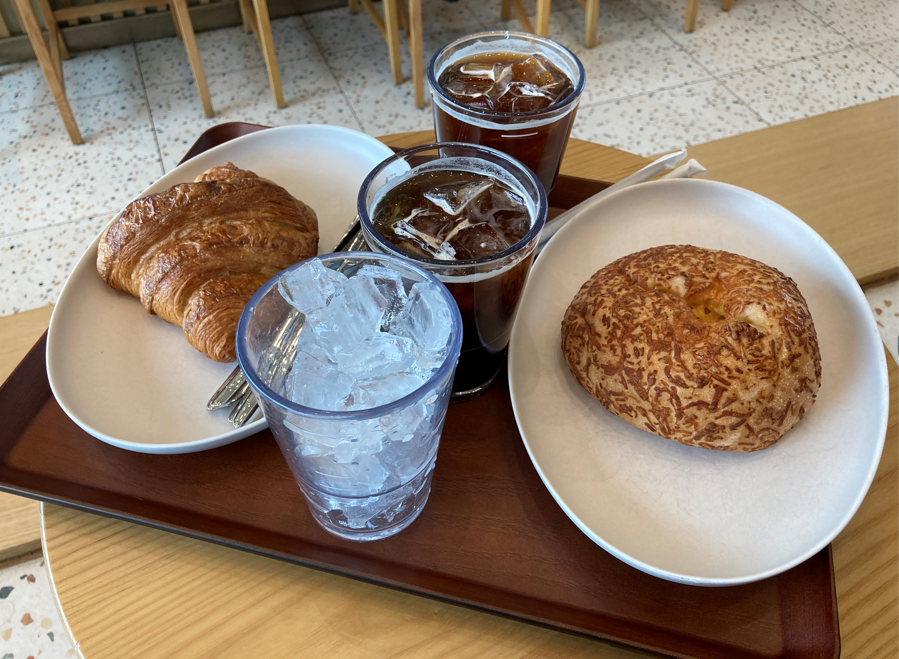 1층에는 모리아라는 카페가 있는데 야외 정원공간(말, 자유의 여신상 등)이 있으니 밖에서 빵과 차한잔 하시기 바랍니다. 빵은 정확한 이름이 아닐수있는데 소금빵, 사과빵, 생크림과일식빵 료렇게 주문했습니다. 소금빵은 짭짤 달달한 버터향의 부드러운 빵이고, 사과빵은 사과퓨레와 크림치즈가 들어있는 쫀쫀한 느낌의 빵, 생크림과일식빵은 바삭한 식빵에 달달한 과일 생크림이 들어 있는 빵입니다. 개인적으로 소금빵 추천.